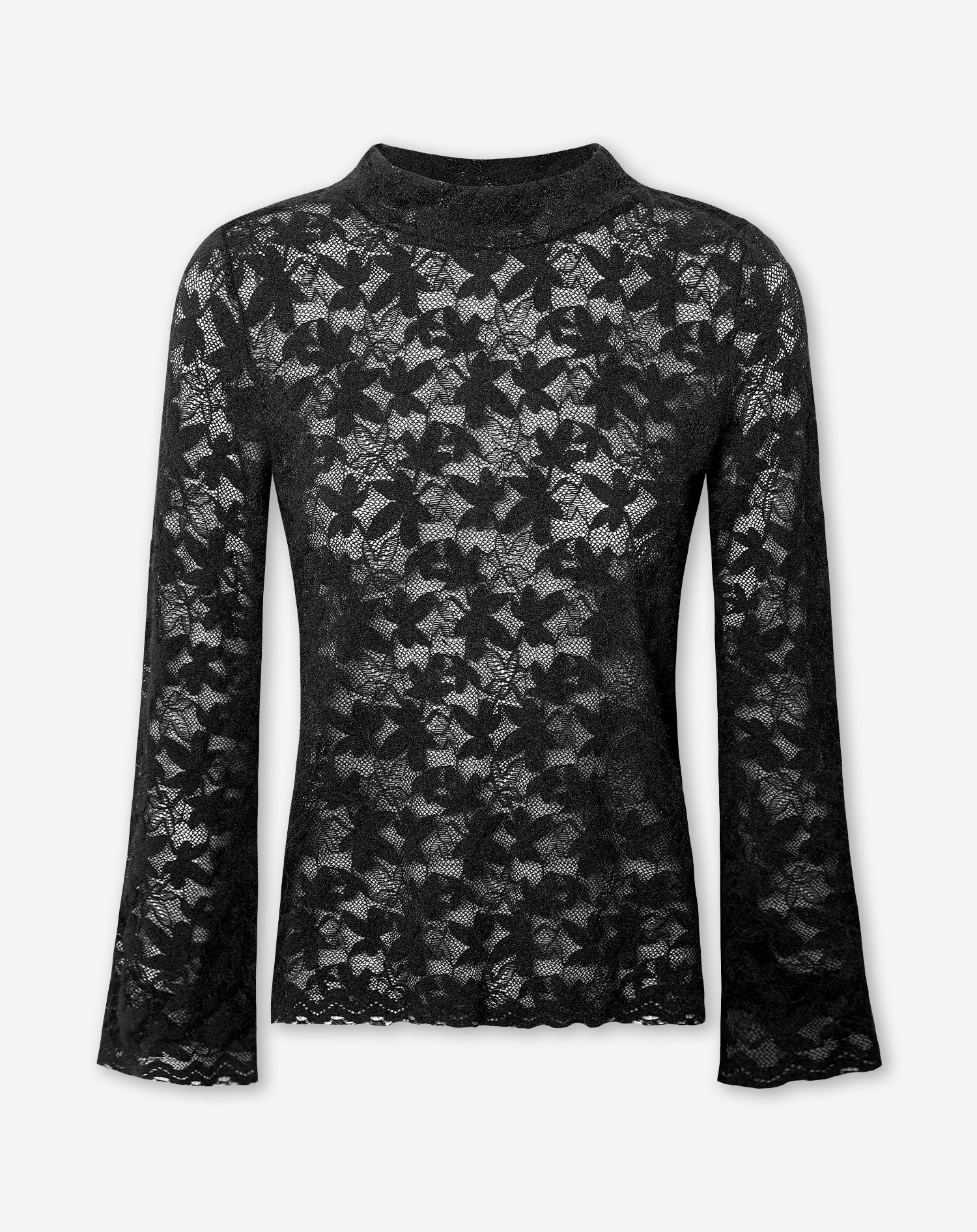 SchwarzDas Oberteil besteht aus schwarzem Spitzenstoff. Das Oberteil hat einen Blumendruck, weite Ärmel und einen Rollkragen. Das Oberteil enthält Stretch.