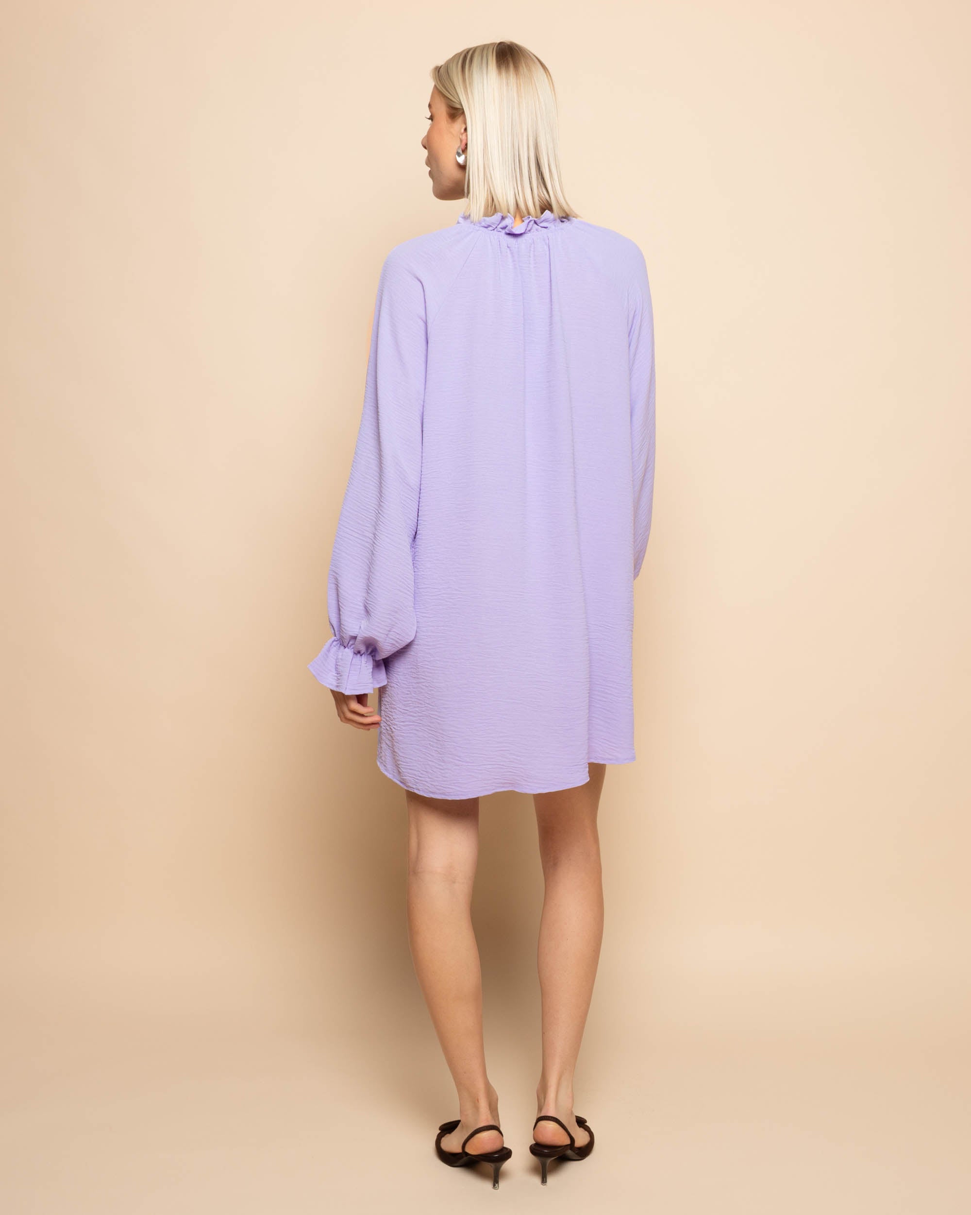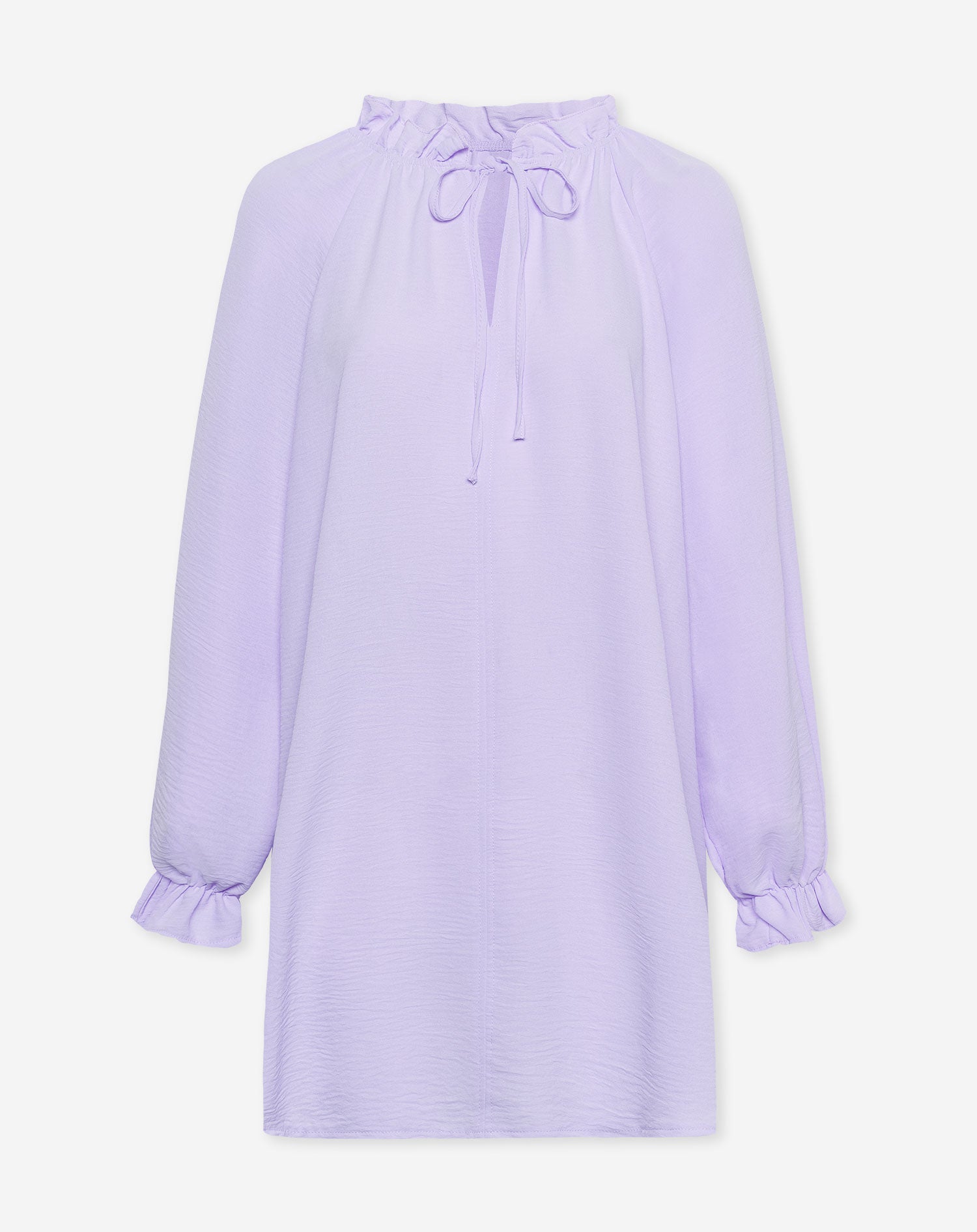 ViolettDas Kleid besteht aus einem LILA, angenehmer Stoff. Das Kleid hat Rüschen im Hals und Kordel. Das Kleid hat Rüschen an den Ärmelenden. Kombinieren Sie das Kleid mit Ihrem Lieblings Gürtel um dies zu stylen.