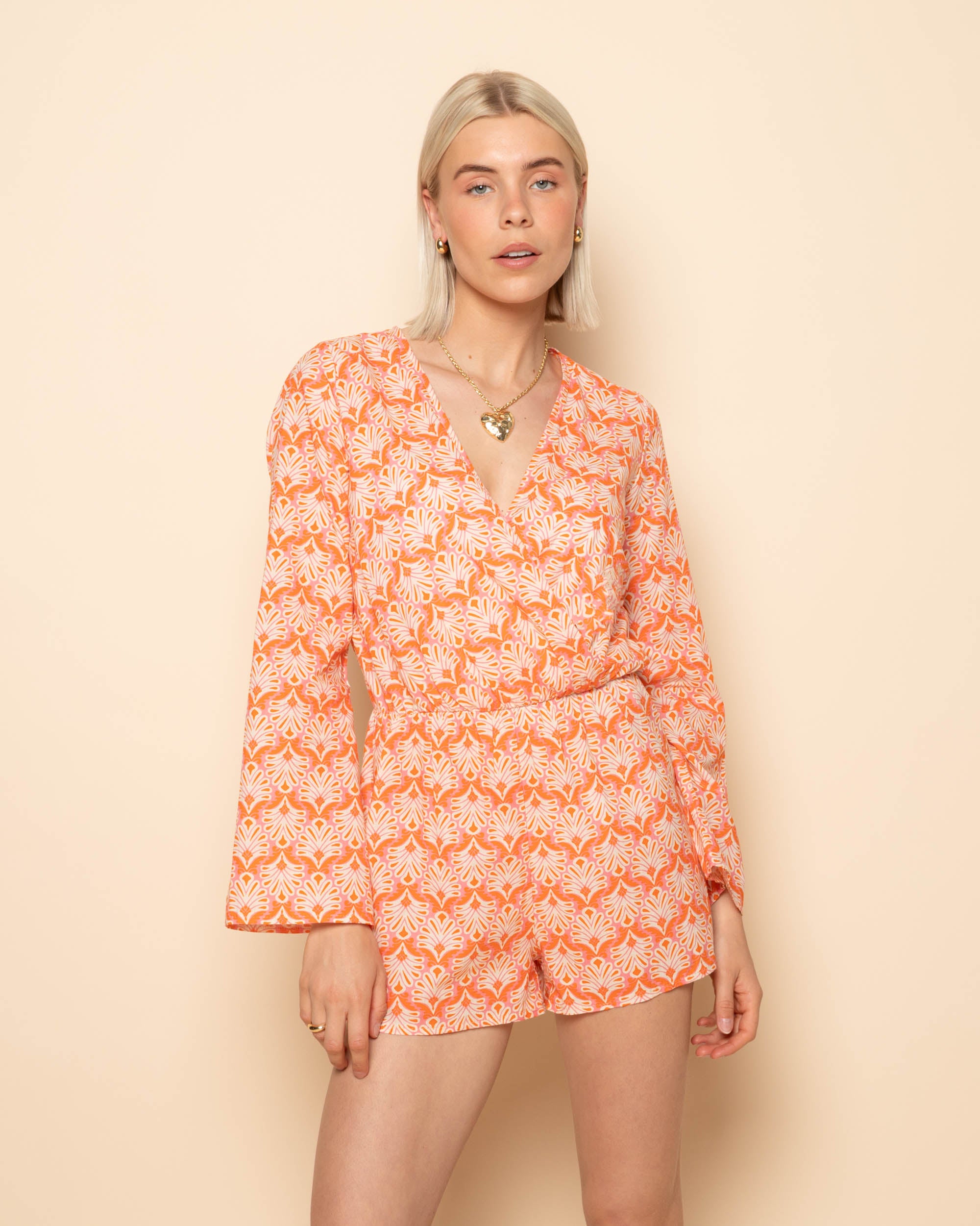 Dieser supersüße Spielanzug hat einen auffälligen Aufdruck, einen V-Ausschnitt und ausgestellte Ärmel. Der Spielanzug hat einen Gummizug um die Taille.