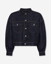 Dark blueThe jacket is made of a dark blue denim fabric and has wide sleeves. There are two chest pockets on the front.
