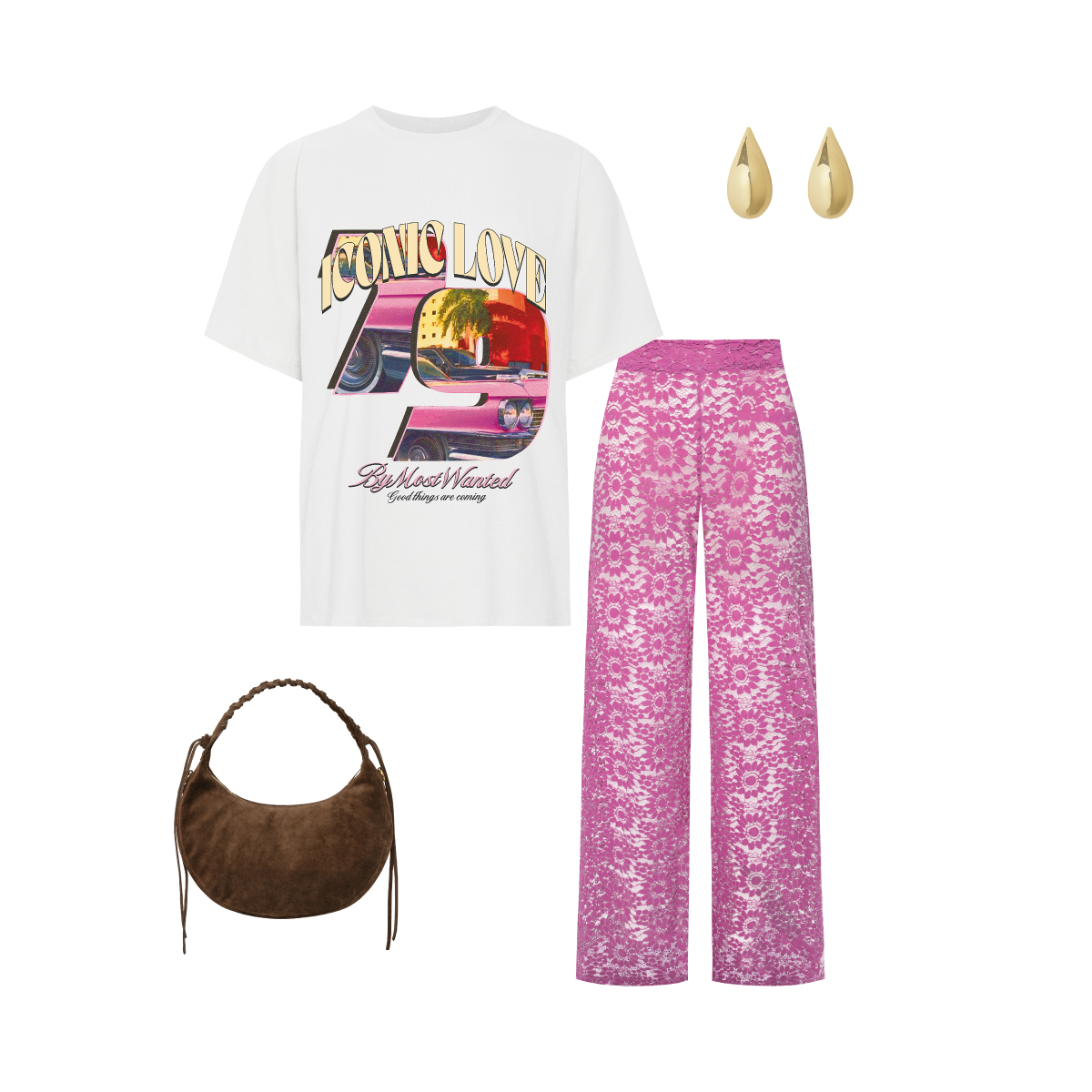The pants are made of a pink, lace fabric. The pants have wide legs and an elastic waistband around the waist.