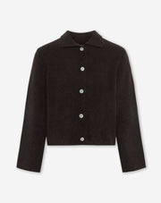 Dark brownThis cardigan is made of a dark brown fabric and features a polo collar. The cardigan has long sleeves and a button closure at the front.