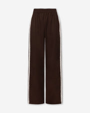 The trousers are made of a brown fabric and have a lace ribbon stripe running along both trouser legs.