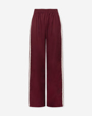 The trousers are made of a burgundy-colored fabric and have a lace tape stripe running along both pant legs.