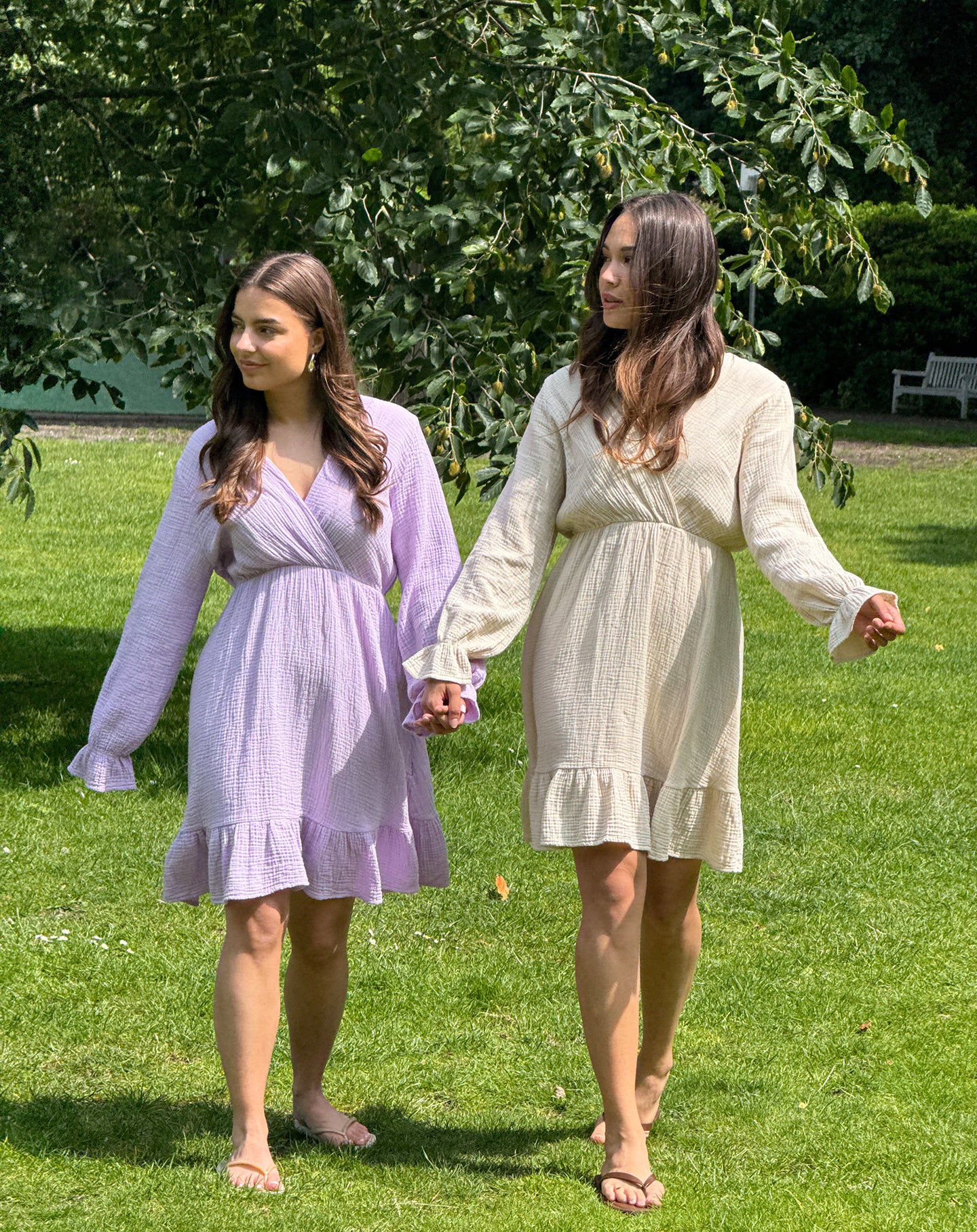 The dress is made of a light, muslin fabric. The dress has a v-neck and has an elastic band around the waist. The dress has ruffles at the ends of the sleeves.