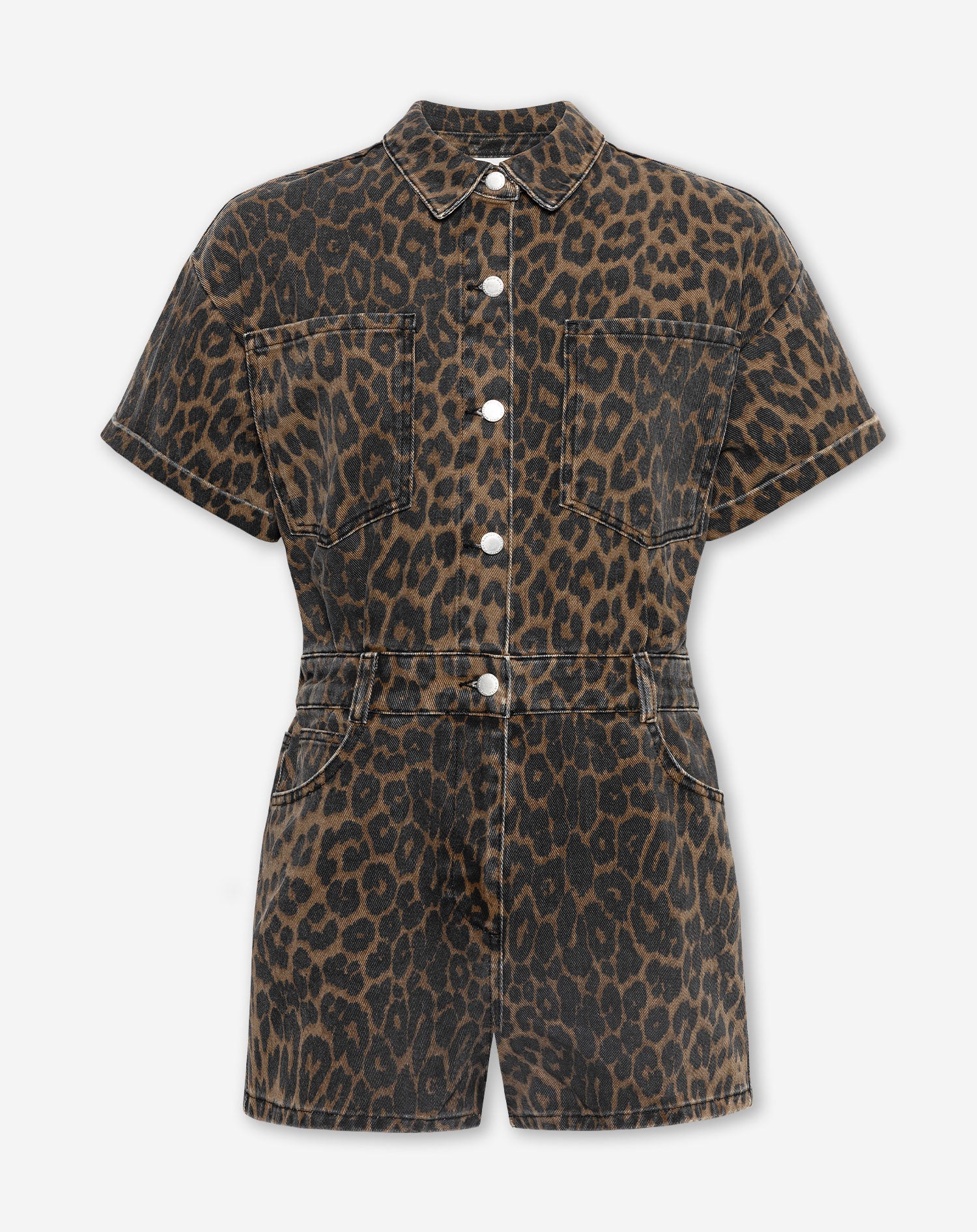 The playsuit is made of a denim fabric with leopard print. The playsuit has pockets and silver buttons.