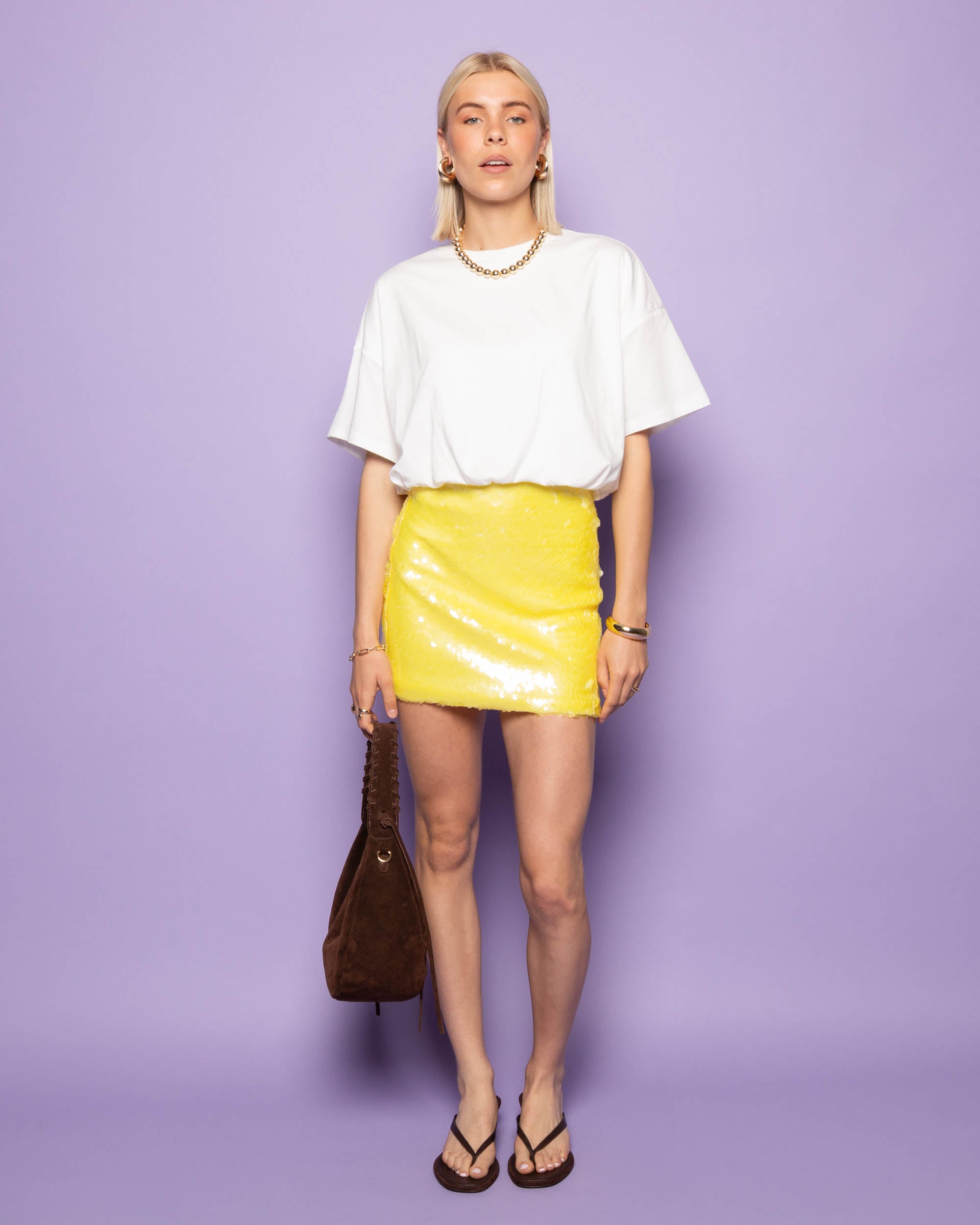 YellowThe skirt is made of a yellow sequin fabric. The skirt is lined and contains stretch, which makes it fit nicely.