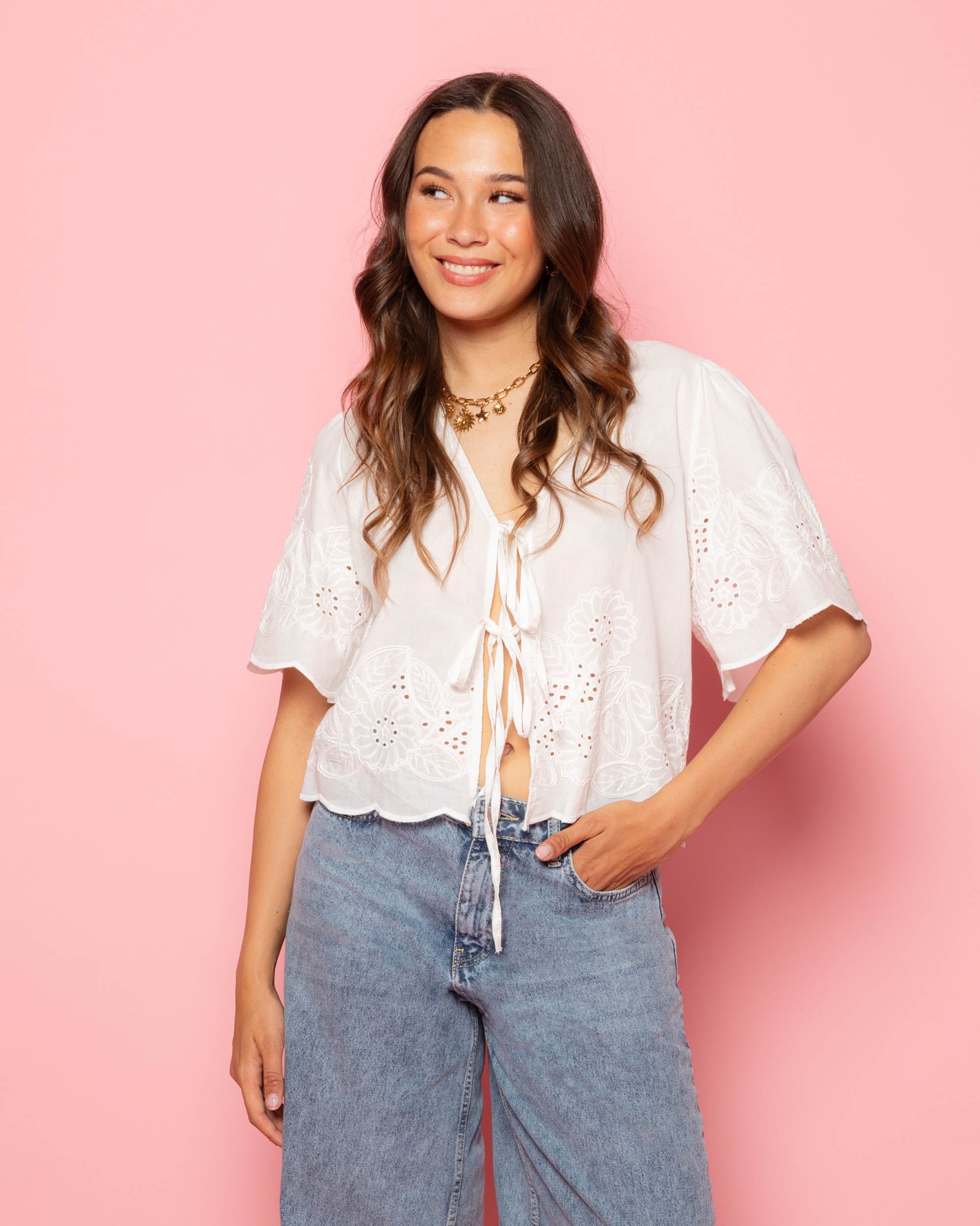 The top is made of a buttery yellow fabric. It has two bows at the front, making it a perfect fit for the current bow trend. It features an embroidered floral print.