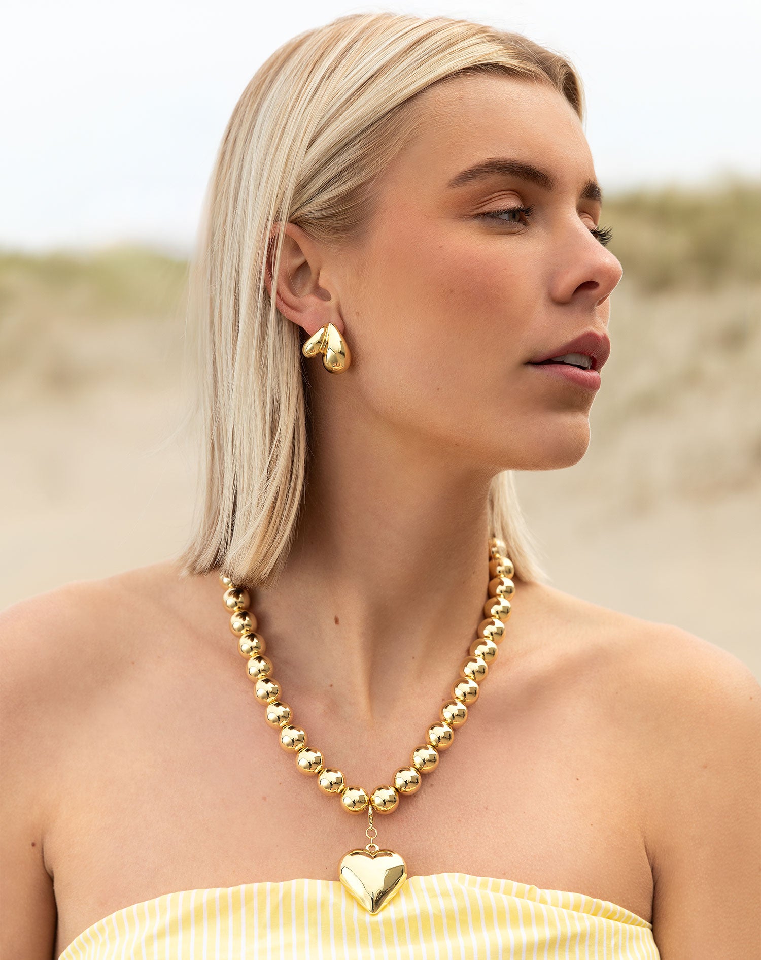 De ketting is goudkleurig en maakt jouw outfit helemaal af. Ze heeft een chunky design met een hartvormige hanger die je los kunt halen – twee looks in één! Draag 'm solo of combineer met andere sieraden voor een trendy look.