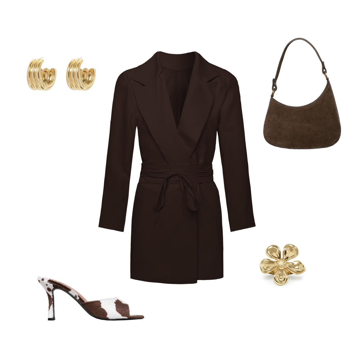 De blazer dress is gemaakt van een wat dikkere, bruine stof. De jurk komt met een los ceintuur met daaraan 2 touwtjes waardoor de blazer dress een unieke look heeft.