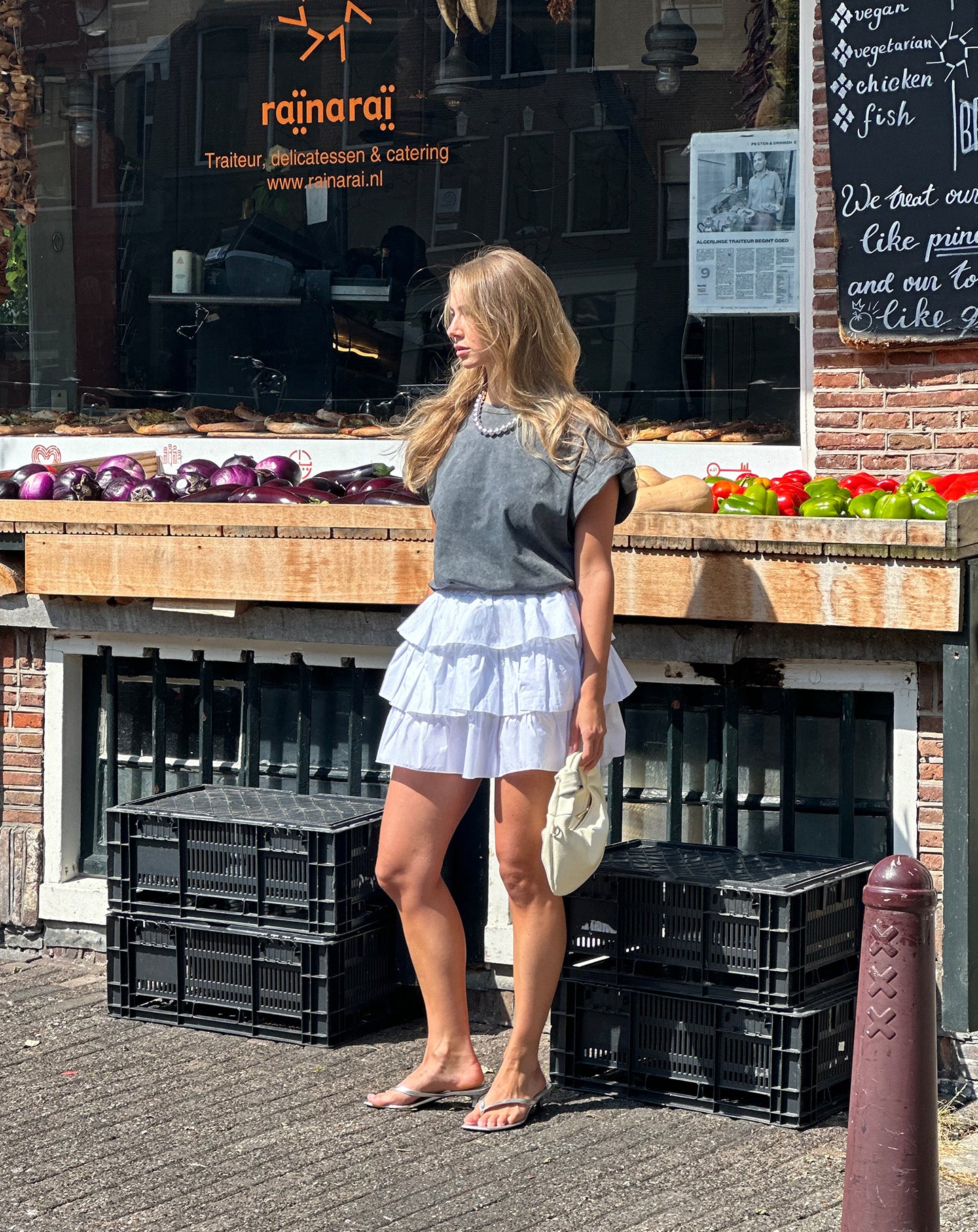 De rok is gemaakt van een witte, katoenen stof. De skirt heeft ruffels en een elastische tailleband.