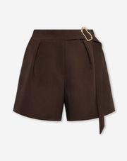 De short is gemaakt van een bruine stof en heeft een goudkleurige buckle. De short heeft elastiek aan de achterkant, waardoor deze mooi aansluit op je lichaam.