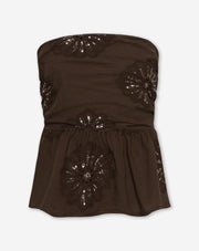 De top is gemaakt van een katoenen, bruinen stof en heeft geborduurde bloemen met pailletten en elastiek op de rug.