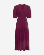 De jurk is gemaakt van een zandkleurige, mousseline stof en heeft een geborduurd bloemetjes patroon. De jurk heeft een v-hals en pofmouwen.