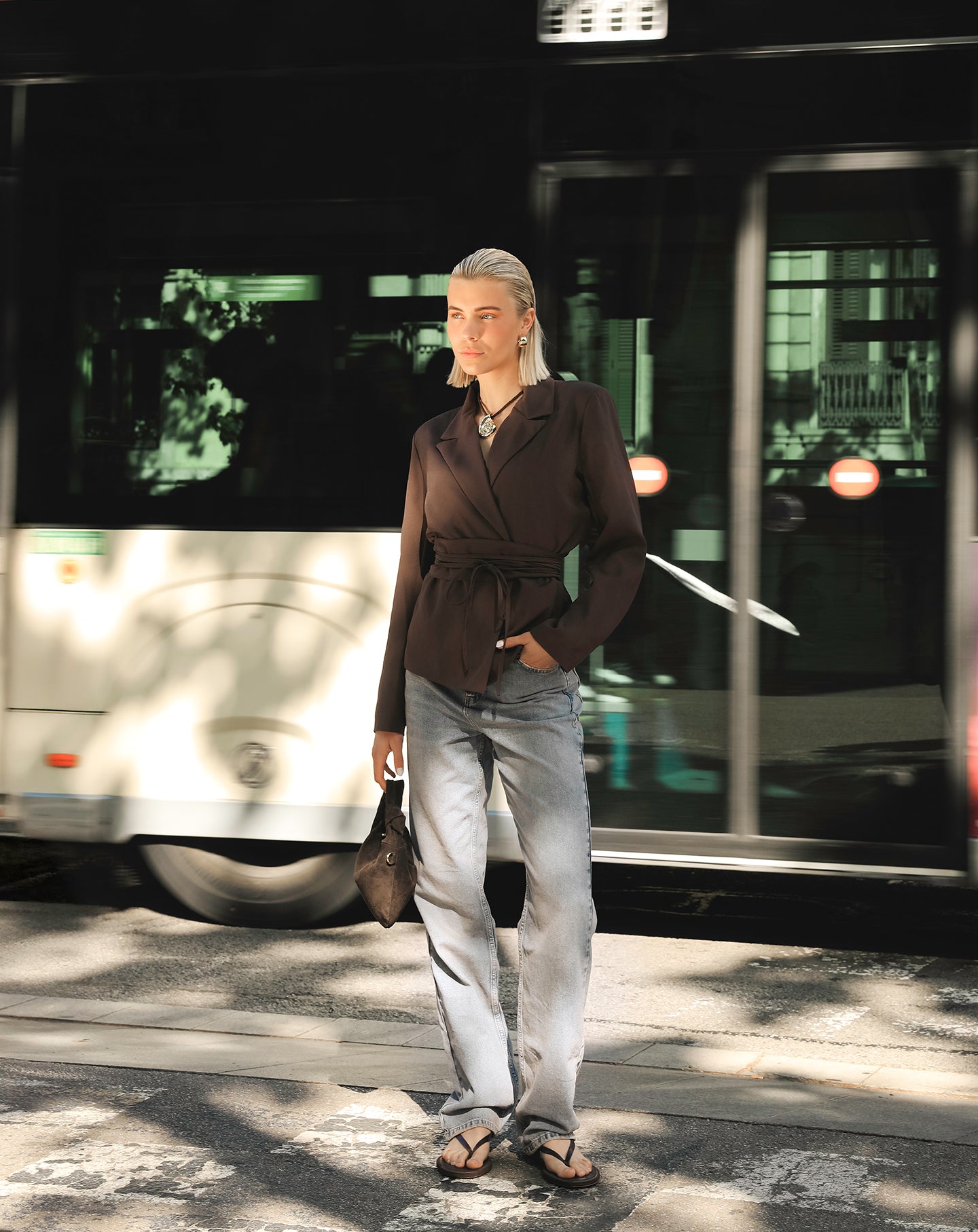 De blazer is gemaakt van een plain donkerbruine stof. De blazer komt met een los ceintuur met daaraan 2 touwtjes waardoor de blazer een unieke look heeft. De blazer heeft schoudervulling.