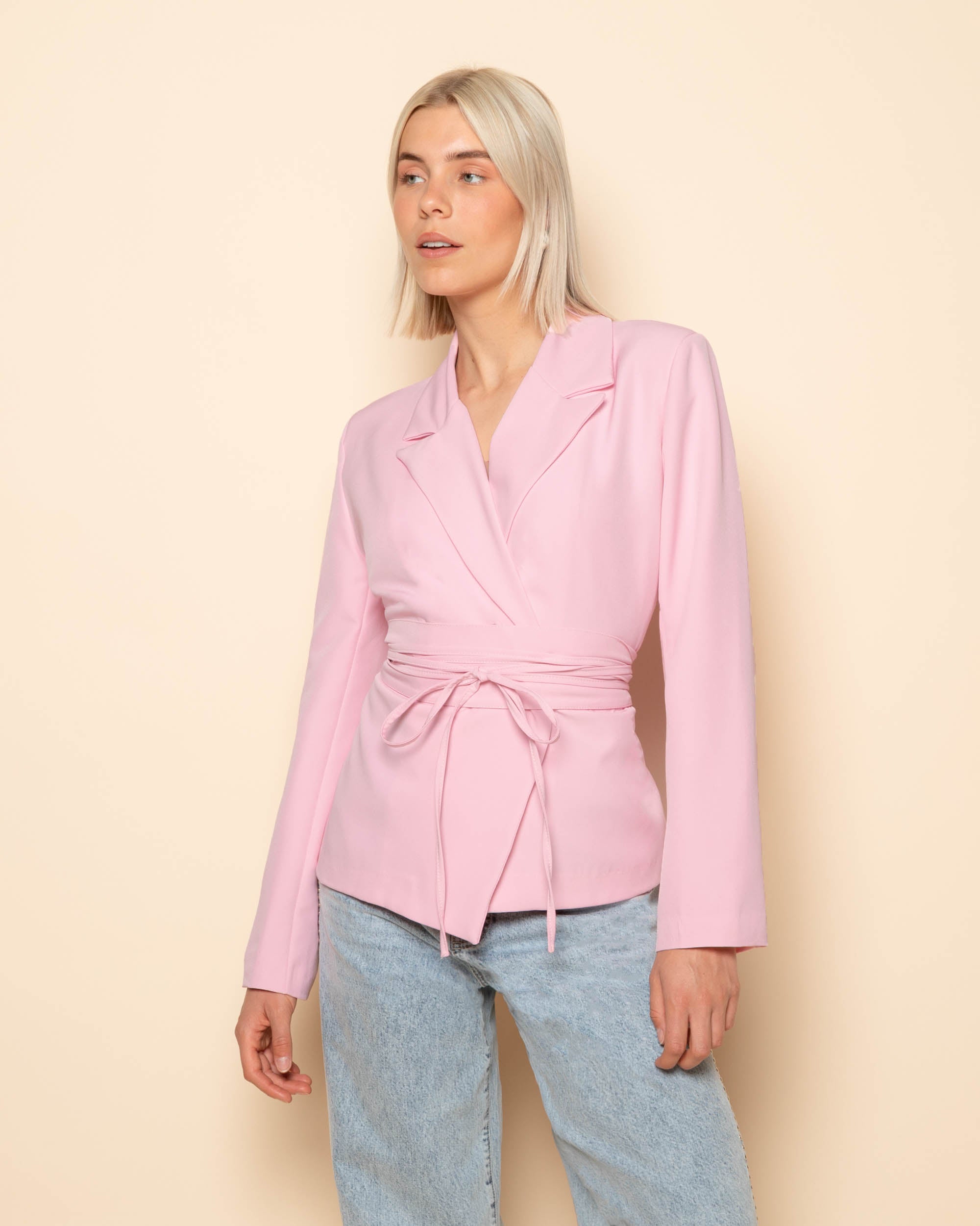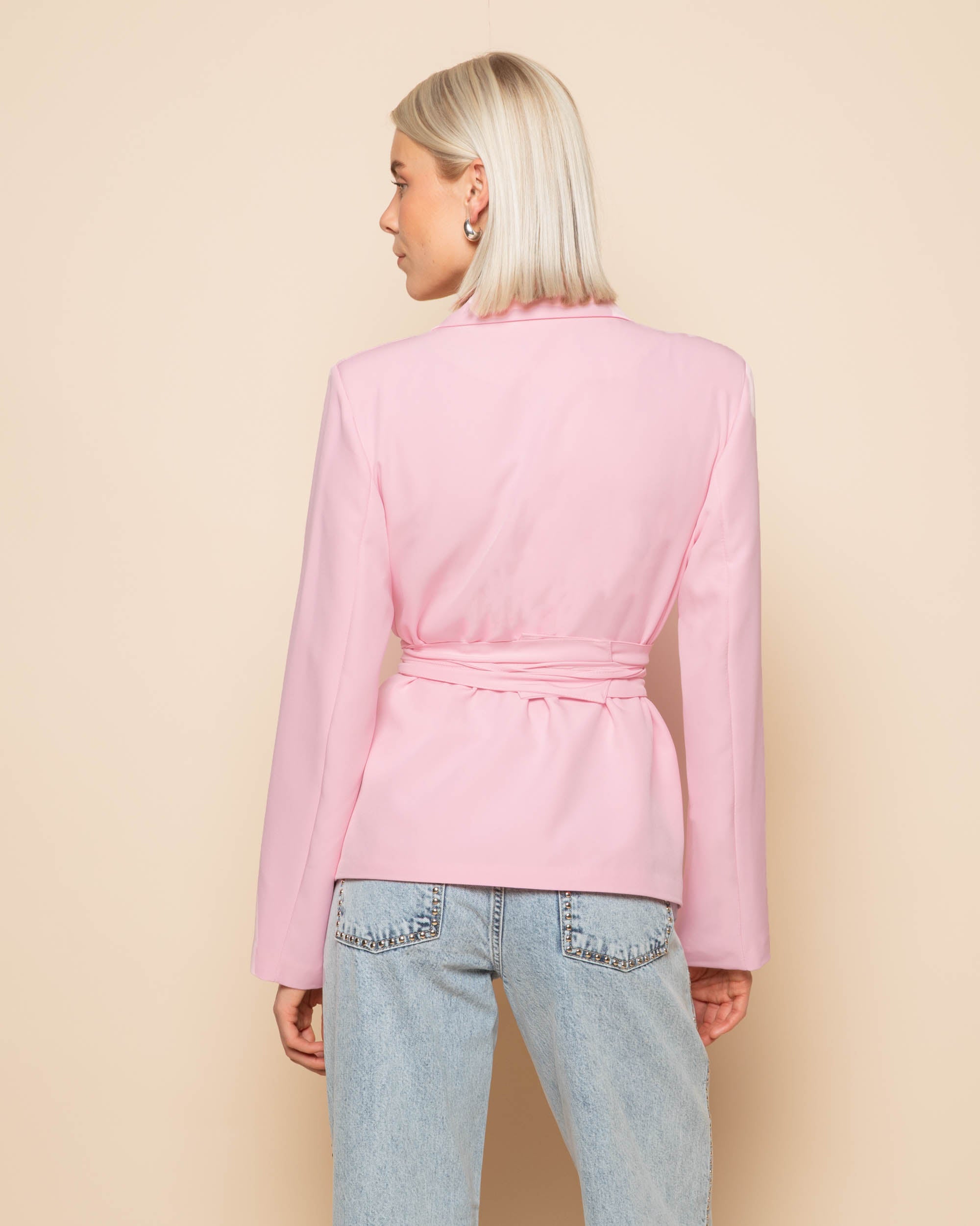 LichtrozeDe blazer is gemaakt van een plain lichtroze stof. De blazer komt met een los ceintuur met daaraan 2 touwtjes waardoor de blazer een unieke look heeft. De blazer heeft schoudervulling.