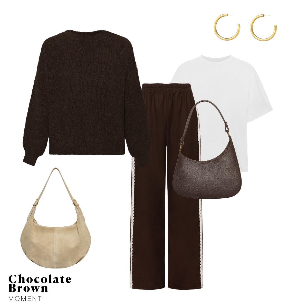 Wil je een extra twist? Je kunt chocoladebruin met neutrale kleuren combineren, of juist met verrassende tinten zoals butter yellow en zachtroze of blauwe kleuren. Deze subtiele accenten breken de bruine look zonder de harmonie te verliezen. Voor een all-in statement ga je volledig monochroom en laat je accessoires in dezelfde warme kleurfamilie terugkomen. Voeg een gouden ketting of nude tas toe om het geheel een luxueuze finishing touch te geven.