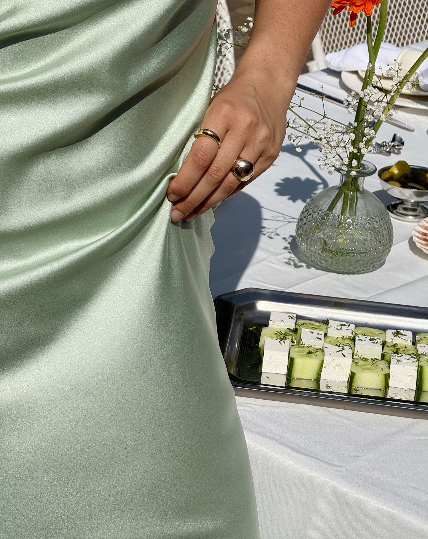 De jurk is gemaak van een pistache-kleurige, satijnen stof. De jurk heeft verstelbare bandjes.