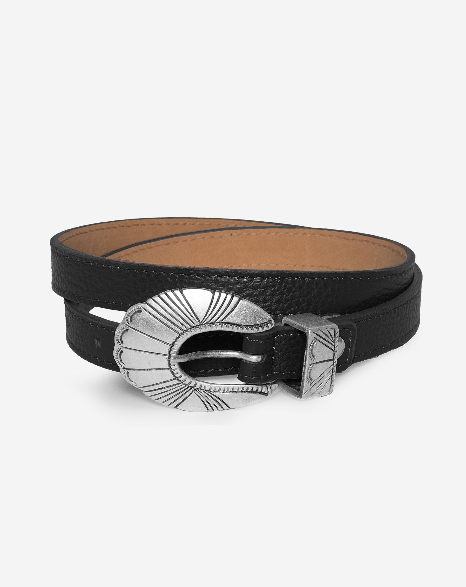 De riem is gemaakt van zwart leer. De riem heeft zilveren, western details en de riem is verstelbaar.