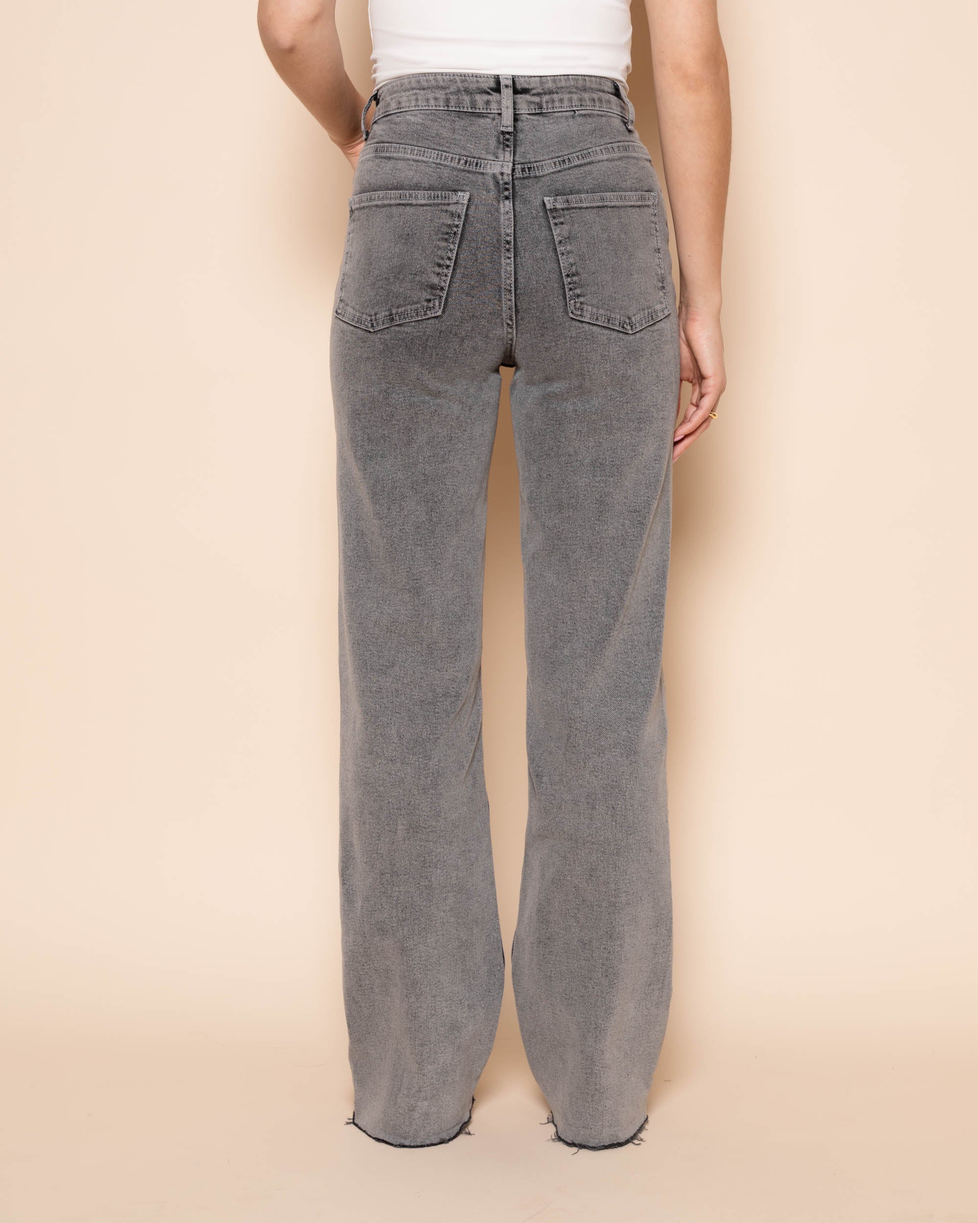 De broek is gemaakt van een grijze denim stof en heeft een bootcut model. De broek is gerafeld aan de onderkant waardoor deze een unieke look heeft. De broek heeft zakken aan de voor- en achterkant.