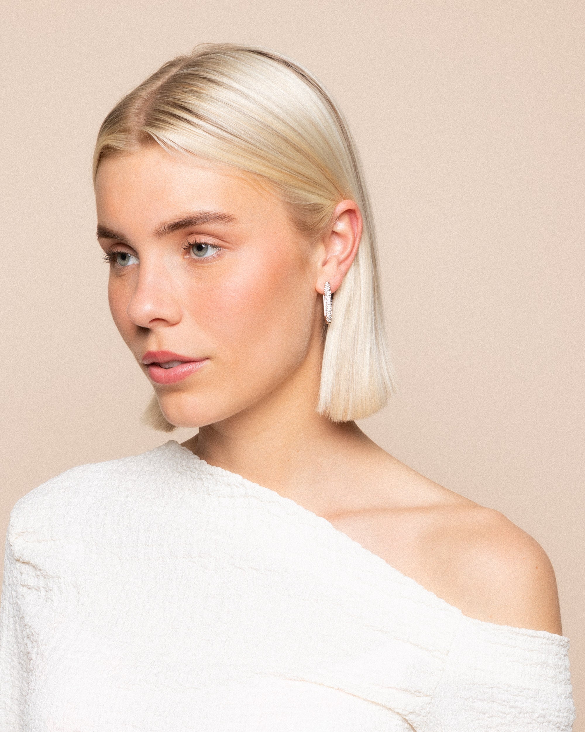 De oorbellen hebben een vierkante vorm en hebben kleine, diamantjes aan de voorkant. De oorbellen zijn zilverkleurig en maken jouw look helemaal af.