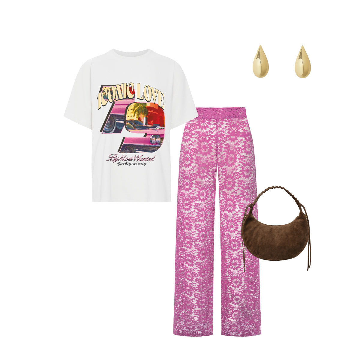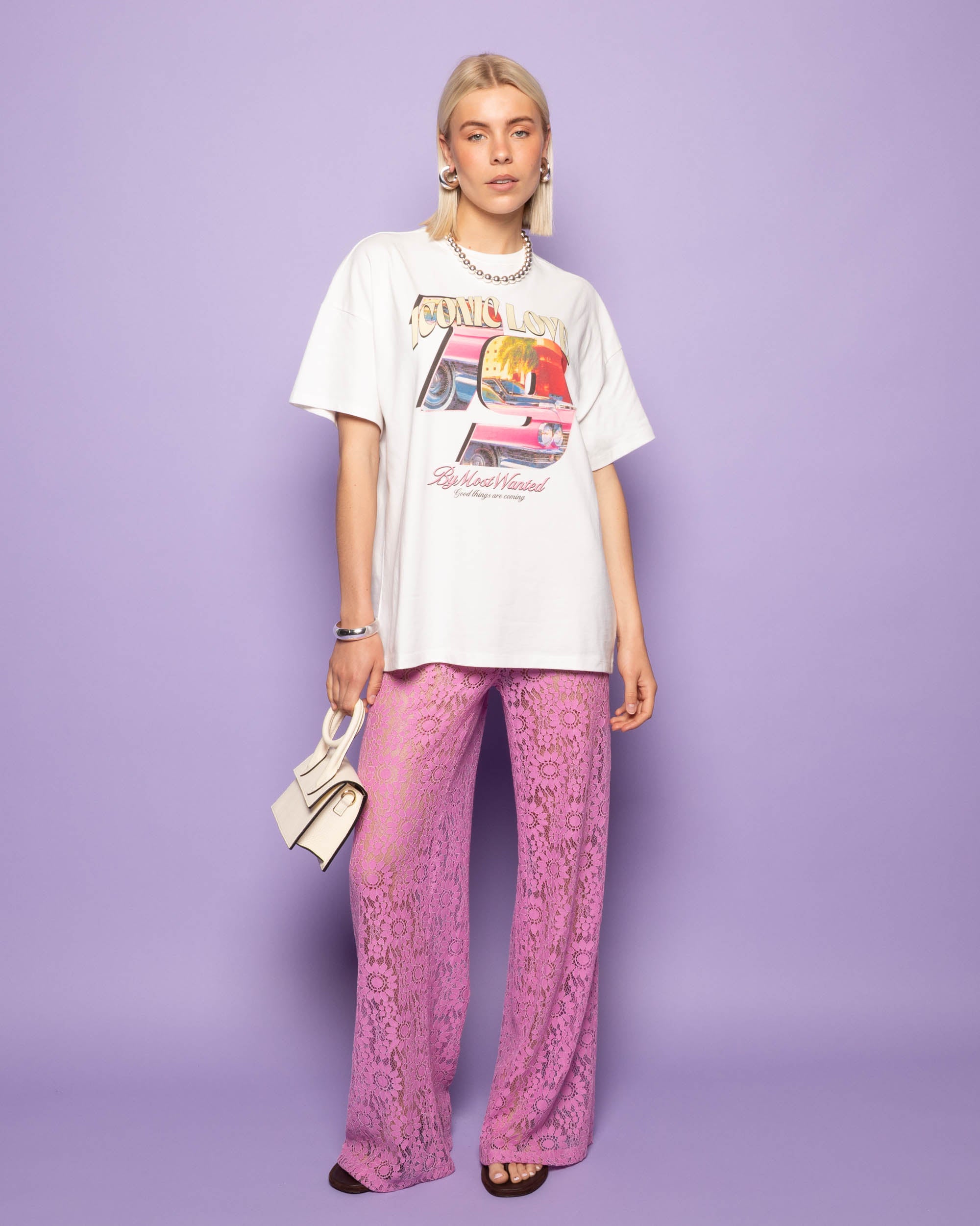 De broek is gemaakt van een roze, kanten stof. De broek heeft wijde pijpen en heeft een elastieken band rond het middel.