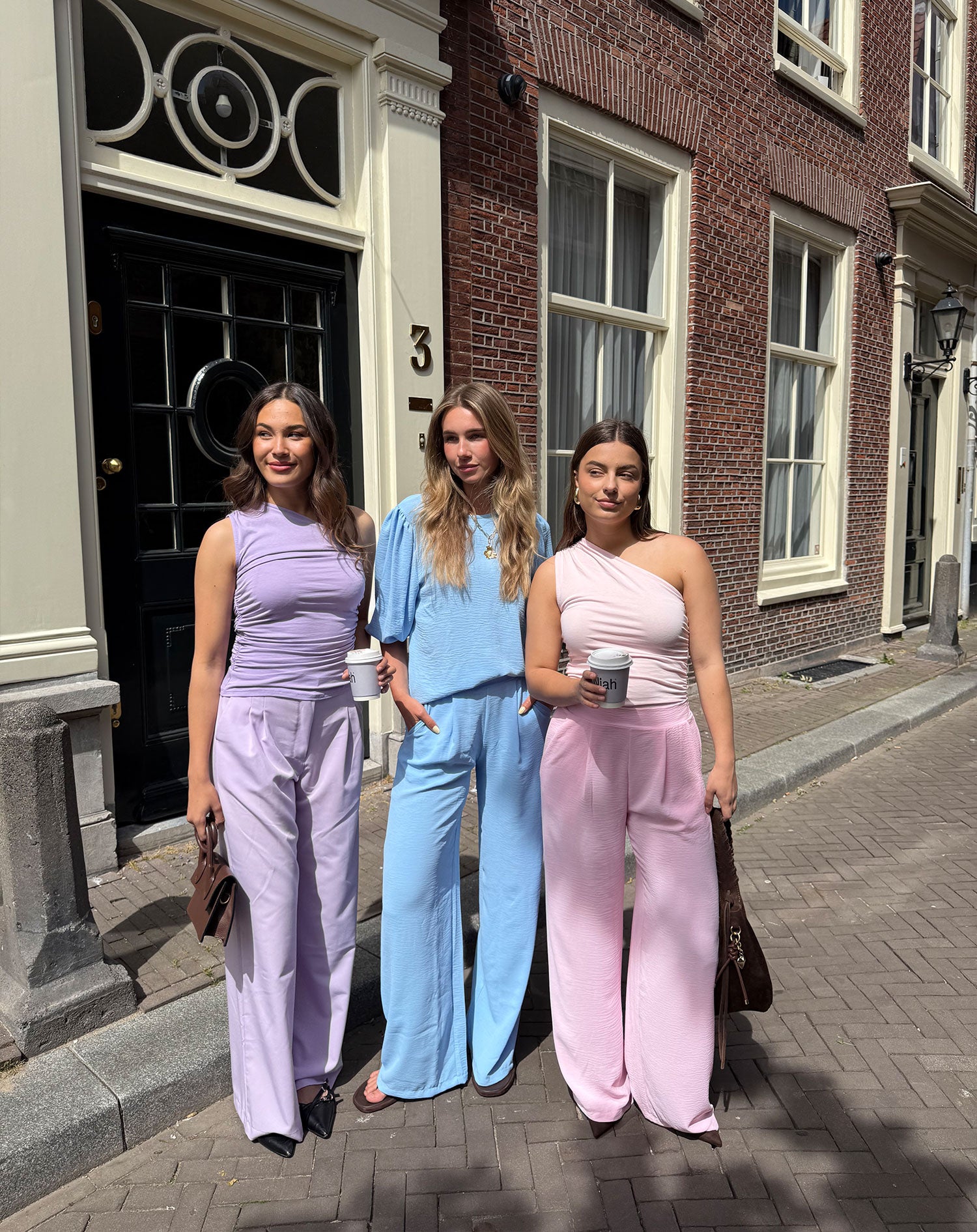 De top is gemaakt van een stretchy, katoenen stof. De top heeft een one shoulder model en is geruched waardoor deze een unieke look heeft.